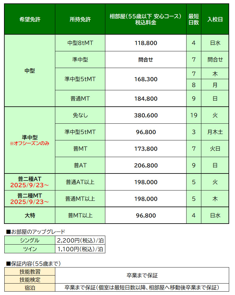 【55歳まで】技能教習・技能検定・宿泊(相部屋):卒業まで保証